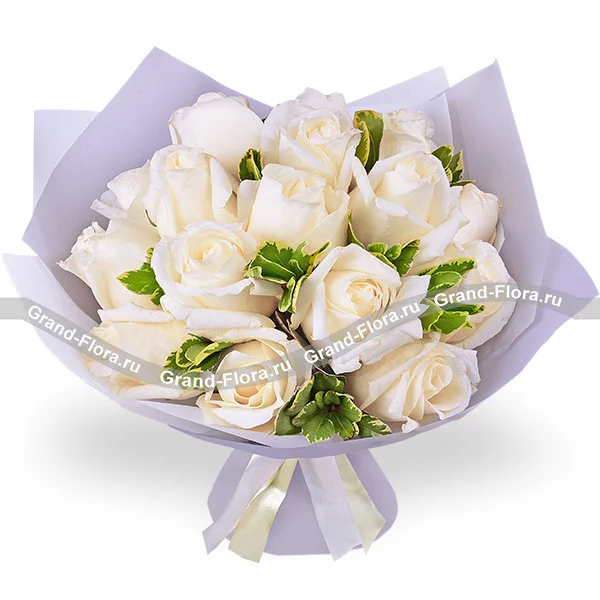 11 роз: роза белая - 11 шт., питтоспорум (возможна замена на фисташку) - 3 шт., упаковка, лента.